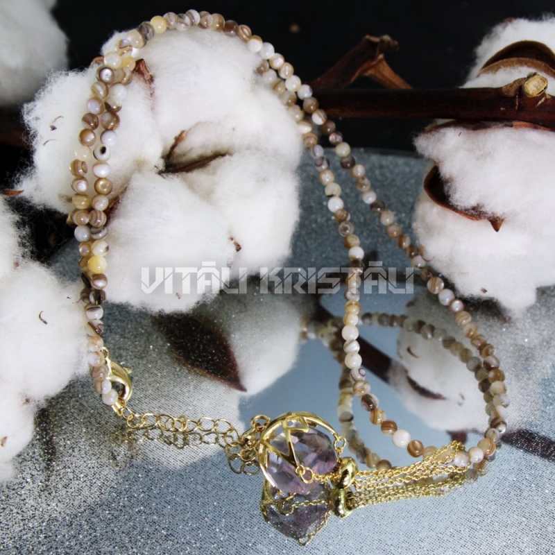 Perlamutrs kaklarota 41 + 4 cm un kulons - turētājs zelta krāsa ar fluorītu