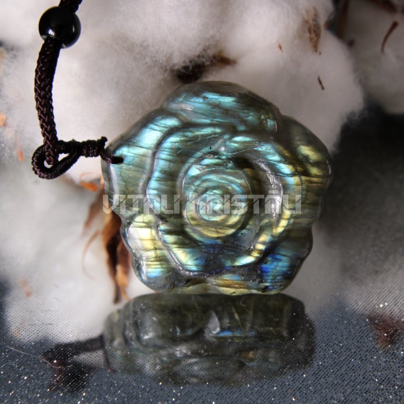 Labradorīts kulons Roze 3.5 x 3.5 x 1 cm ar pītu aukliņu max. 60 cm