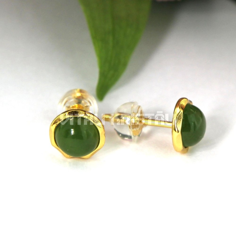 Нефрит серьги гвоздики серебро позолота 6 мм 1 пара