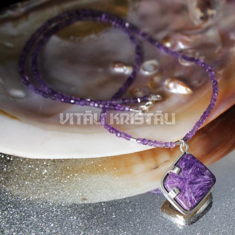 Чароит 30 x 23 мм кулон и аметист 2.3 мм бусы серебро 49.5 см