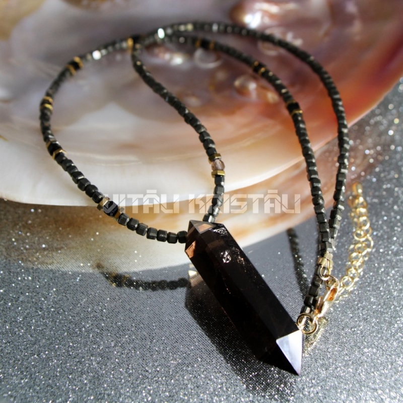 Пирит, шпинель 2.3 мм бусы 47 см и дымчатый кварц кулон маятник LUX 4.5 x 1.8 см