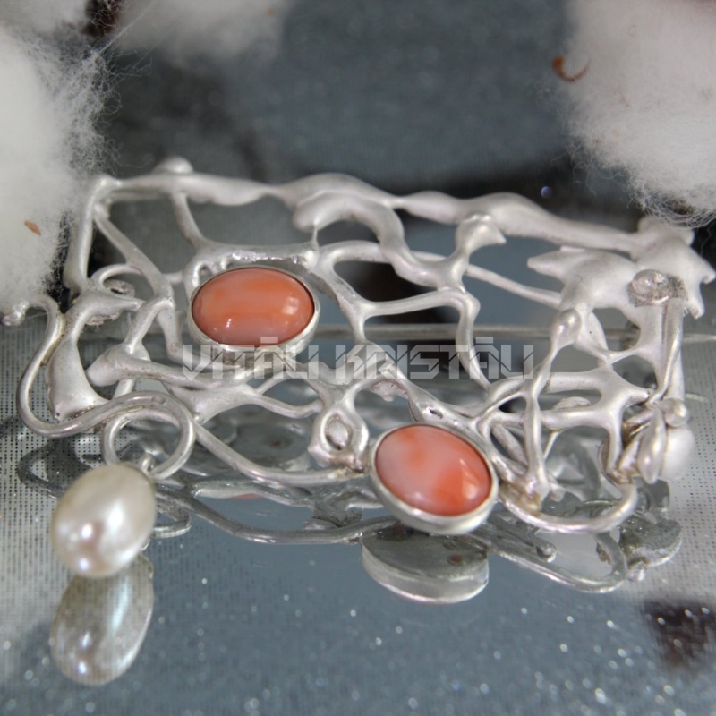 Жемчуг, коралл брошь серебро 5.5 x 4.5 см