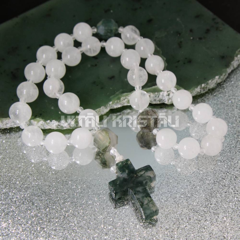 Горный хрусталь 8 мм, моховой агат чётки 30 + 3 бусин