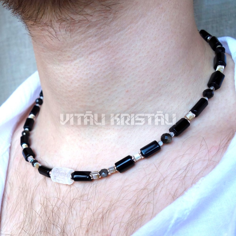 Турмалин черный шерл, горный хрусталь, перламутр, обсидиан чокер 46 + 4 см